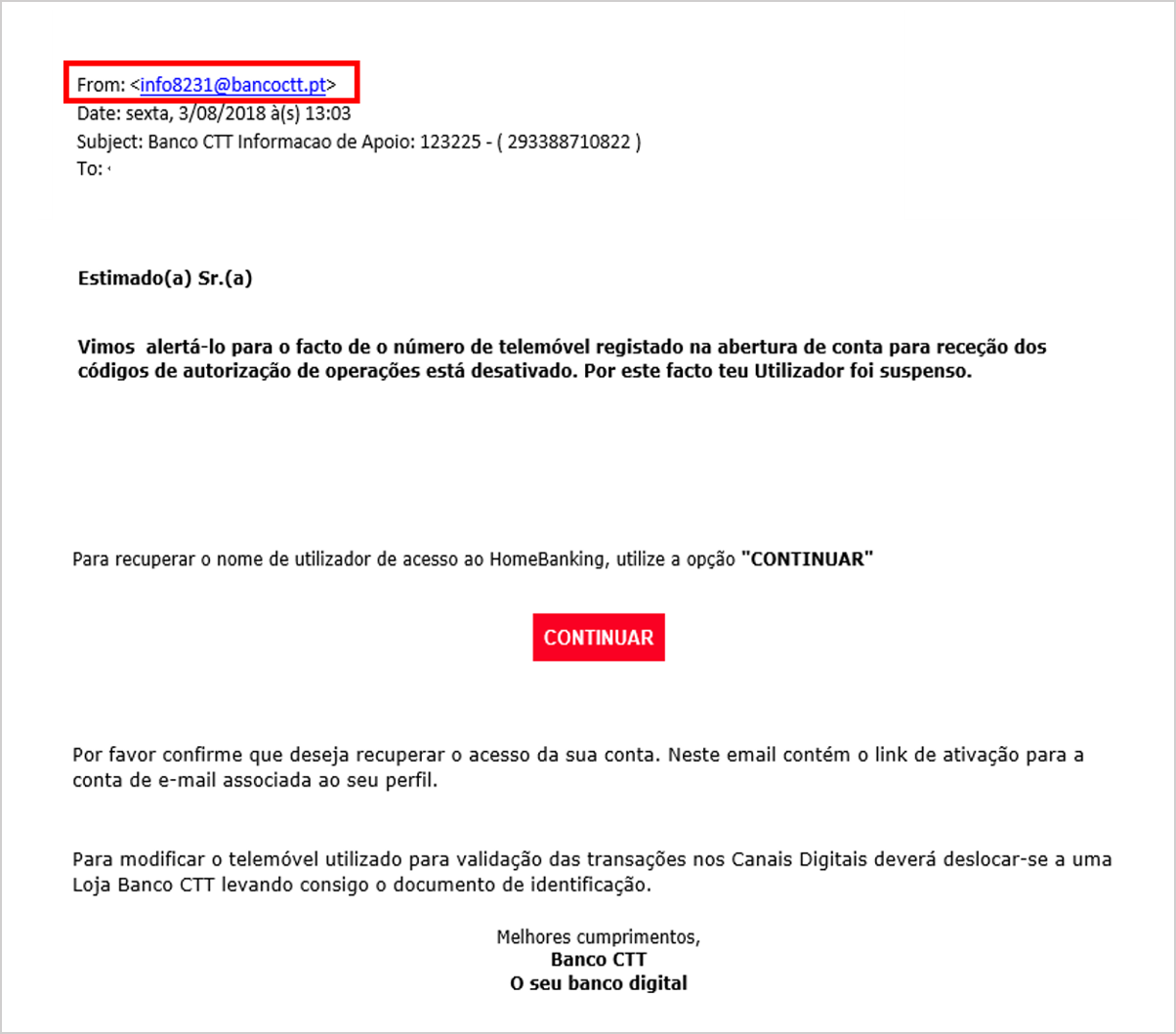 Alerta de e-mails falsos utilizando o nome do Banco CTT – 03/08/2018 Estão a ser enviados e-mails falsos a Clientes do Banco CTT, a informar que o código de utilizador do Homebanking se encontra desativado e como tal o acesso à conta foi bloqueado. Tratam-se de e-mails fraudulentos que visam recolher os códigos de utilizador do Homebanking, acedendo desta forma à conta dos Clientes. Não deve clicar em qualquer link, uma vez que será direcionado para um site falso do Banco ou para um conteúdo que poderá comprometer a segurança da sua Conta.Caso receba um e-mail desta natureza deverá apagá-lo de imediato e reportar a situação, através da Linha de Apoio Banco CTT 707 288 282. Se clicou no link, não tente aceder ao seu Homebanking e contacte-nos de imediato. Recordamos que o Banco CTT nunca solicita informações sensíveis dos seus clientes através de e-mail. Suspeite e não responda a e-mails onde lhe peçam dados pessoais ou confidenciais, como a sua palavra-passe, códigos de acesso ou número de telemóvel.